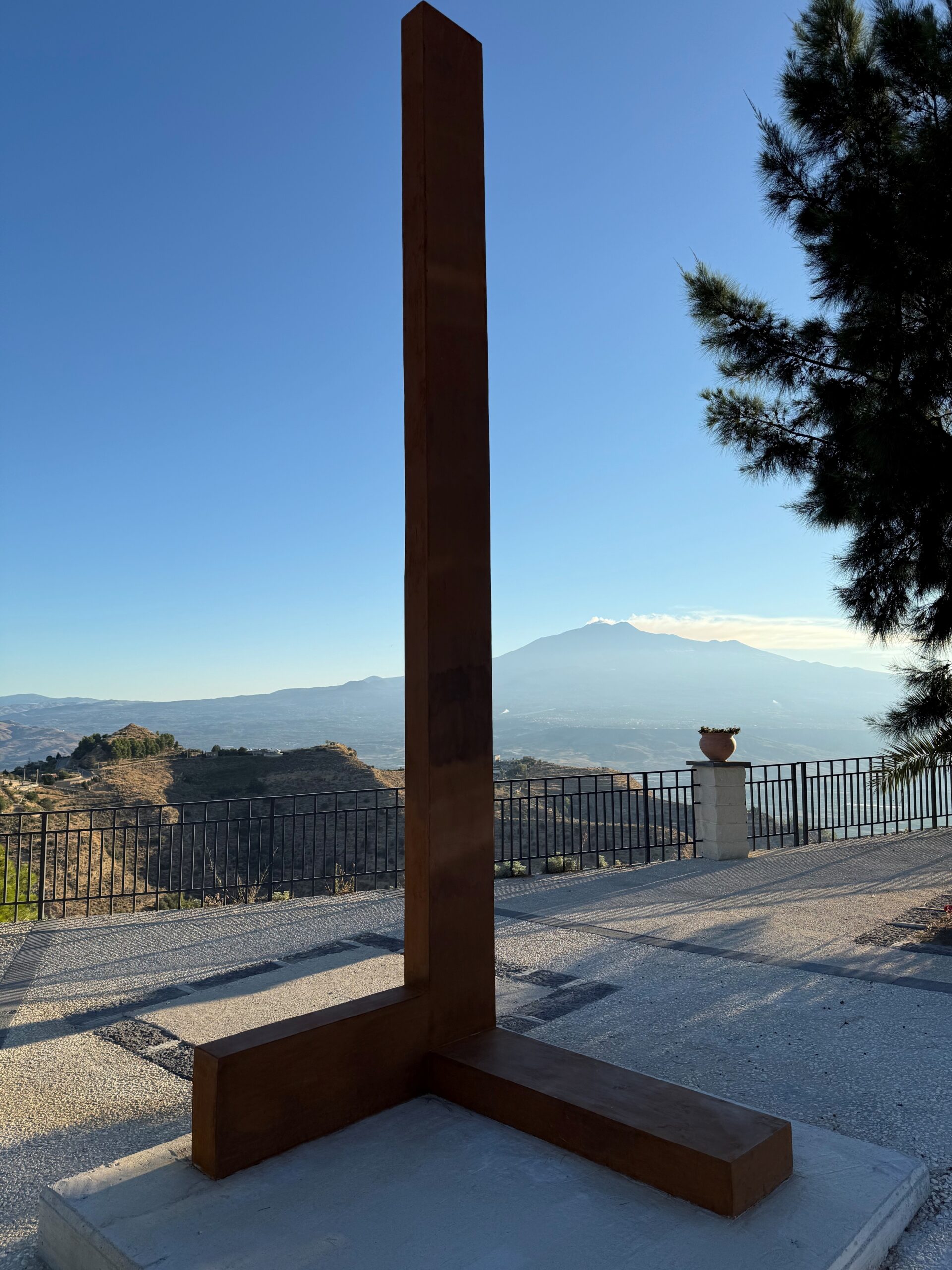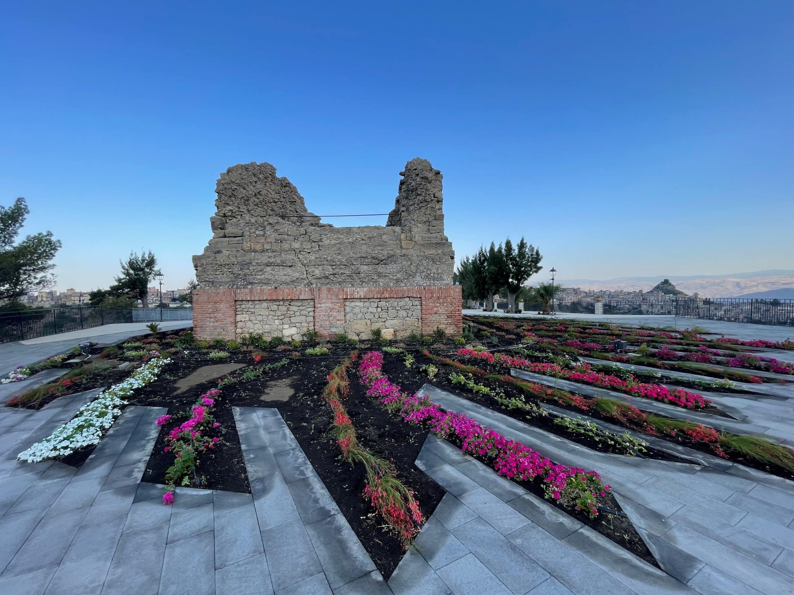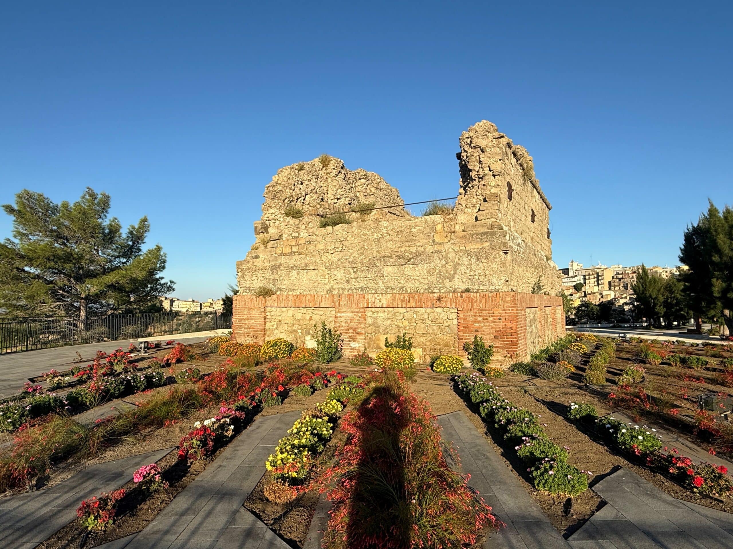 In quegli anni, infatti, la Sicilia era soggetta a scontri fra la famiglia degli Angioni contro quella degli Svevi e proprio questi ultimi tentarono di riprendersi il dominio siciliano. L’edificio funerario aveva la forma di un tempietto su podio con l’ingresso rivolto verso l’Etna. Ciò che oggi è visibile sono le pareti dei lati lunghi del podio e le fondazioni della struttura. L’interno del podio doveva essere suddiviso in due vani; uno destinato alla camera sepolcrale, che originariamente doveva possedere una volta, l’altro che costituiva una pre-camera.