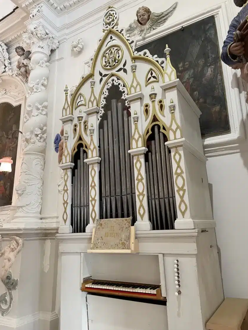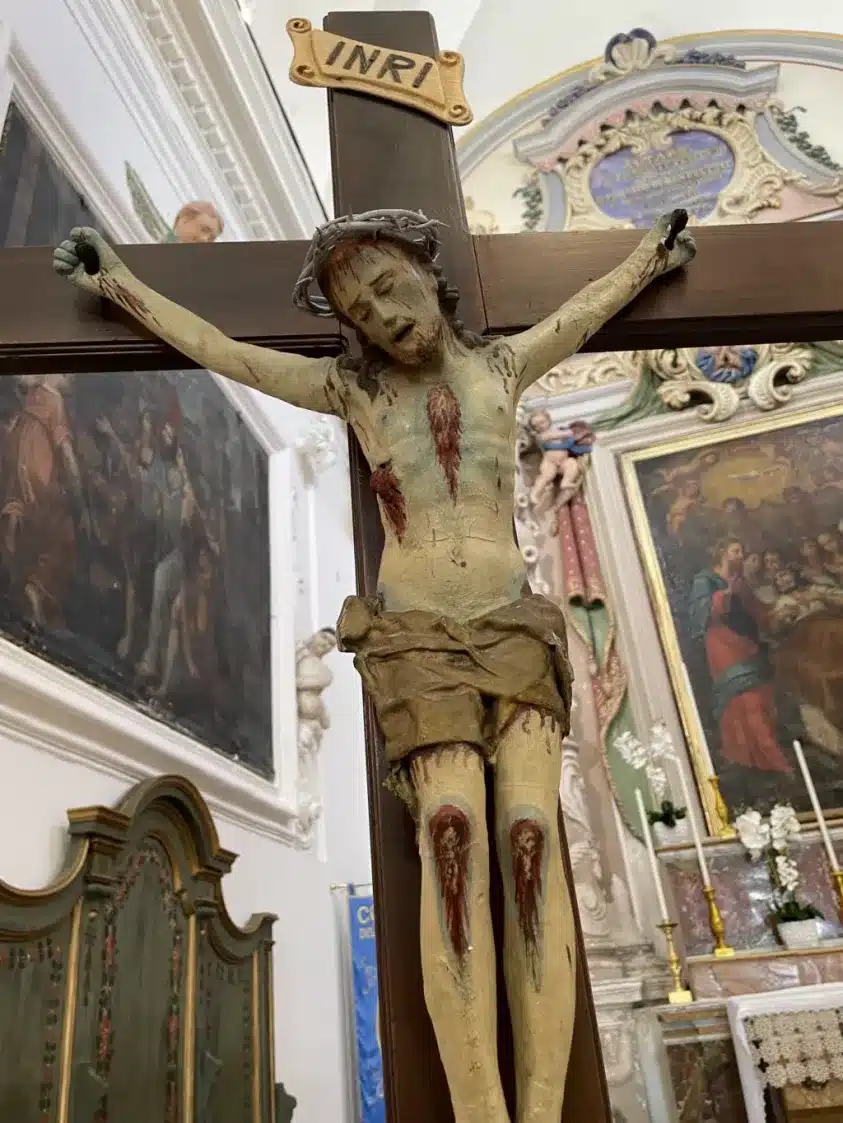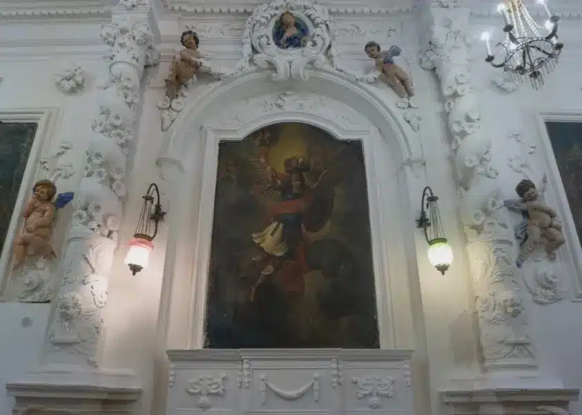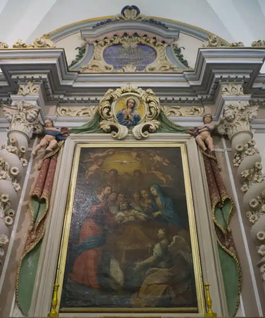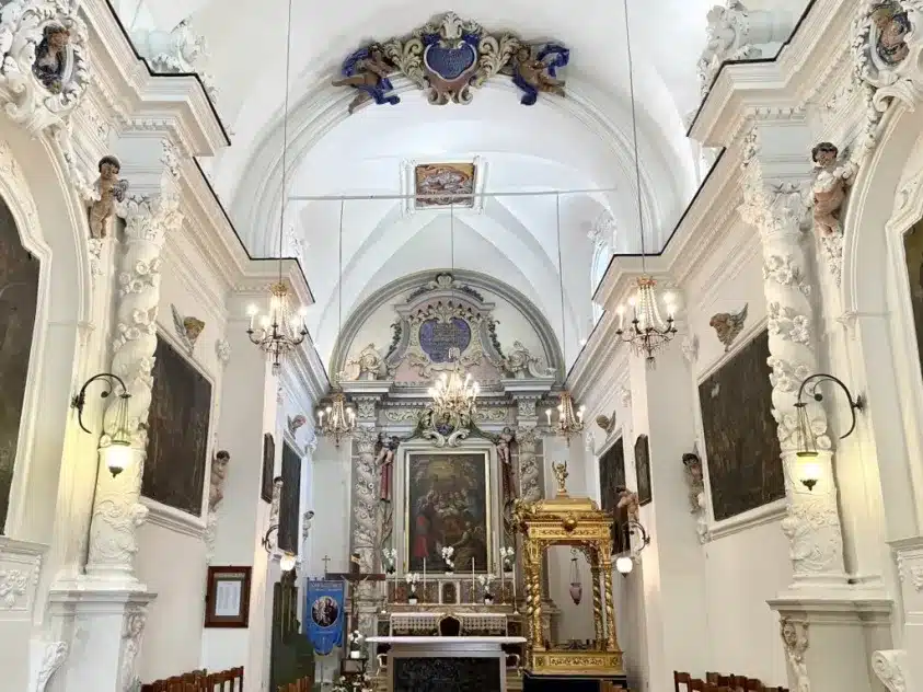 Più avanti, sempre sulla destra, l’altra tela raffigurante la parabola “del ricco e Lazzaro”, con putti laterali. Ai lati dell’altare principale ci sono altre due tele: quella di San Gaetano con il Bambino in braccio e quello di San Francesco da Paola, quella con scena bibliche e una che raffigura probabilmente Tobia.