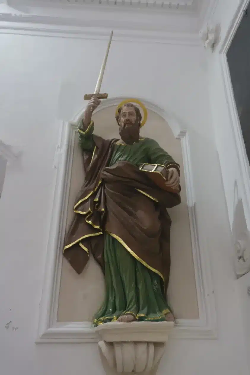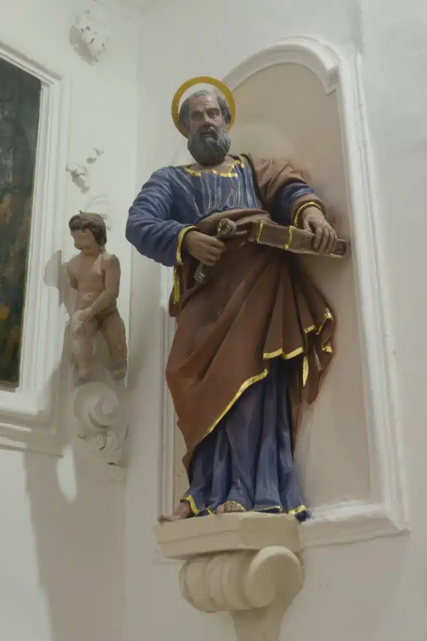 Entrando notiamo due statue in stucco che rappresentano i Santi Pietro e San Paolo. Ai due lati della navata due tele non documentabili, mentre proseguendo a destra abbiamo un altare molto ricco, con colonne tortili, putti e vari affreschi. In questo altare c’è una tela che rappresenta la Sacra Famiglia con San Vito e San Filippo di Agira e nella decorazione superiore in altorilievo ( in stucco ) è rappresentata Sant’ Agata.