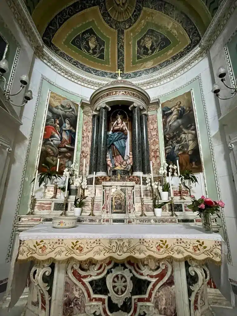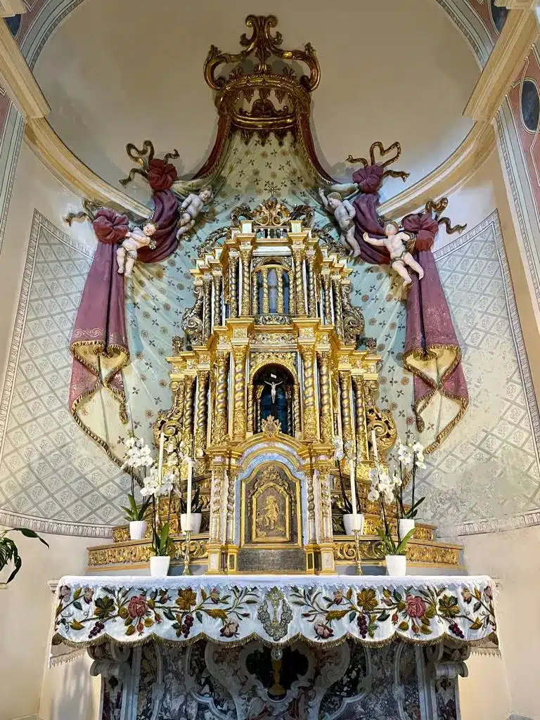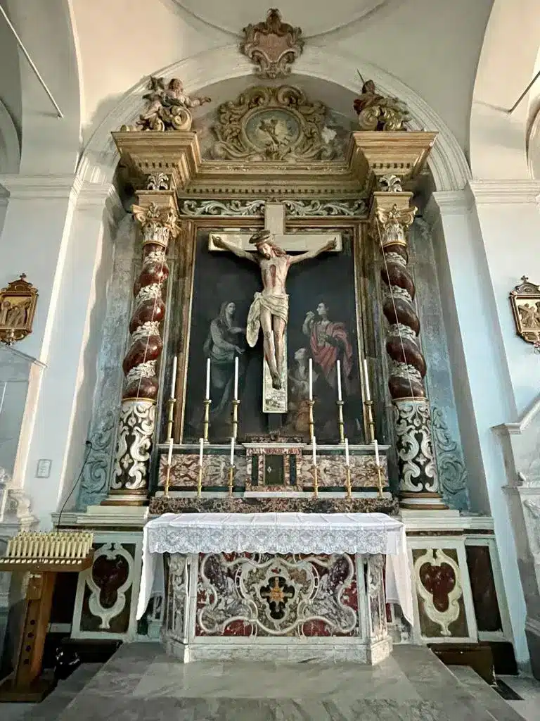 La navata destra, che ha inizio con l’area riservata al fonte battesimale, propone quattro altari marmorei: il primo ha un dipinto degli inizi del ‘600 che rappresenta la Trinità; al secondo altare, una Madonna del Carmelo, altra tela recentemente restaurata, di Giacomo Portale (1803). Nell’altare successivo c’è una composizione più complessa, costituita da un Cristo ligneo seicentesco poggiato su una croce interamente rivestita di specchi; la croce ha come sfondo una tela del 1820 con la Madonna, San Giovanni e la Maddalena.