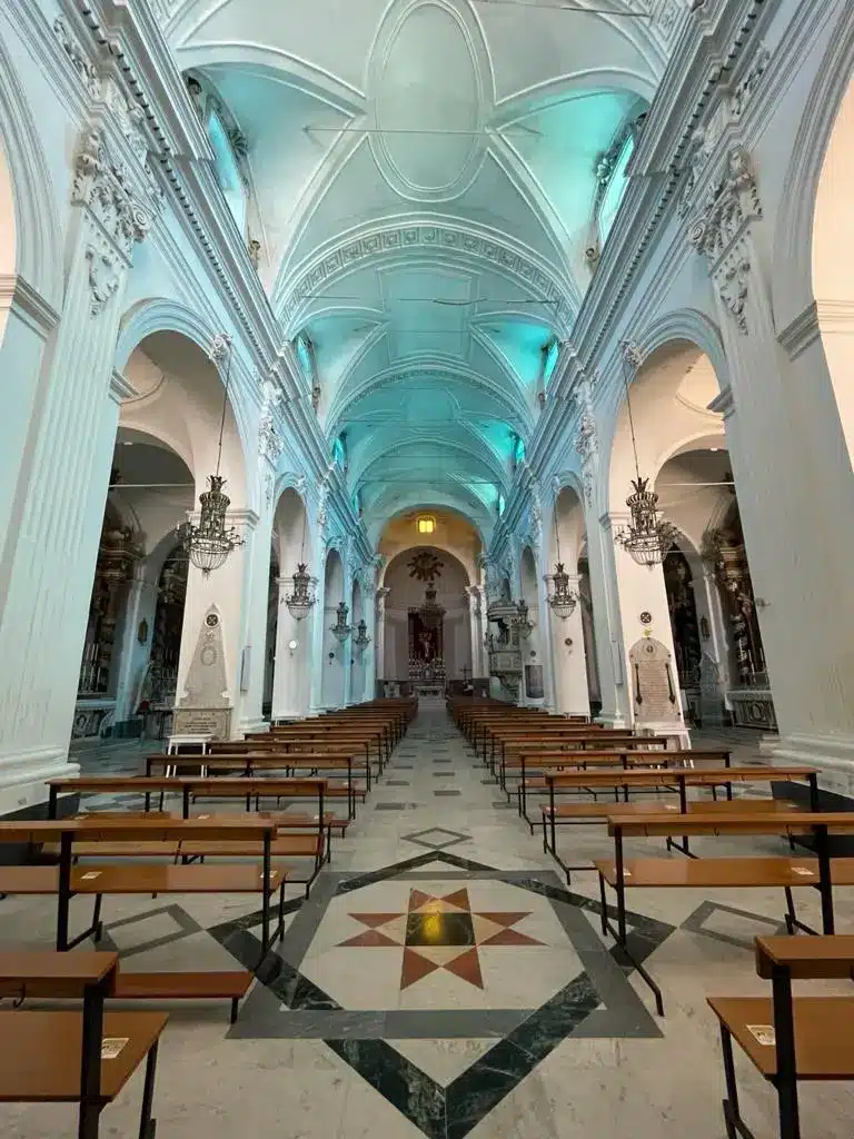 L’interno, ricco di stucchi, colonne tortili, elementi floreali e putti di sapore popolaresco, è a tre navate chiuse da absidi. Partendo dall’ingresso, nella navata sinistra s’incontrano cinque altari marmorei: il primo dedicato ai Santi Ignazio di Loyola, Luigi e Stanislao. Nel 2017 la tela è stata restaurata a cura della sopraintendenza ed è saltato fuori il dipinto originale che raffigura il Santo con ai piedi un mappamondo e ai lati quattro personaggi che rappresentano i quattro continenti.