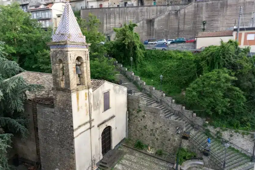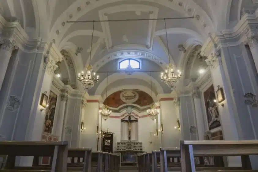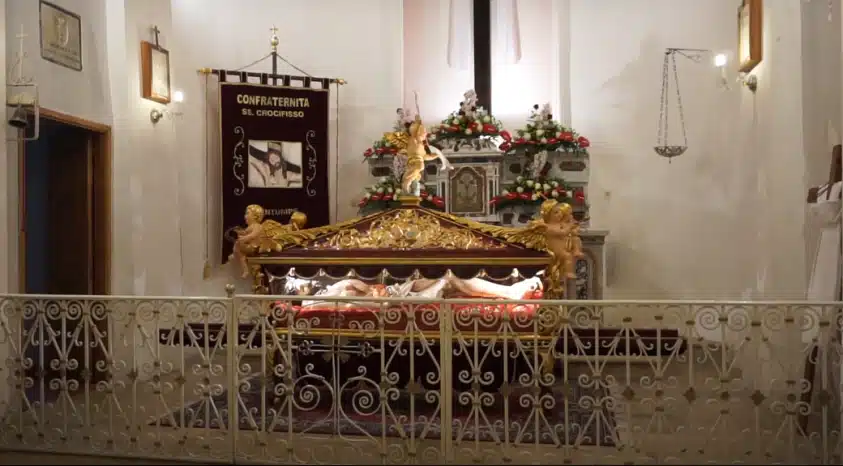La Chiesa è rinomata perché custodisce il “tambuletto”, una pregiata teca in legno dorato e in vetro che custodisce la statua di Gesù morto, visibile una volta l’anno in occasione della processione del Venerdì Santo. Adiacenti alla chiesa, sul dato dx vi è una interessante scalinata in pietra, decorata da pannelli in ceramica che rappresentano le quattordici stazioni della Via Crucis.