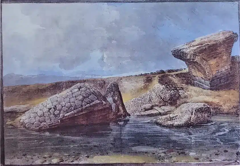 Grazie all’Houel sappiamo dell’esistenza di un ulteriore troncone che all’epoca riaffiorava dal terreno, ma che oggi è di nuovo interrato. Questo costituiva la rampa di accesso al ponte ed è l’unico a mantenere ancora il basolato del pavimento. Secondo i resti, il ponte avrebbe dovuto essere costituito da sei arcate, per un totale di sette campate, di cui quella centrale più ampia delle altre.