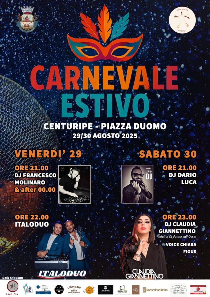Uno degli eventi piรน attesi dellโestate รจ il Carnevale Estivo, organizzato dal Comune di Centuripe in collaborazione con lโAssociazione Cinque Caps. Due serate di musica, spettacolo e divertimento destinate a coinvolgere tutti.ย