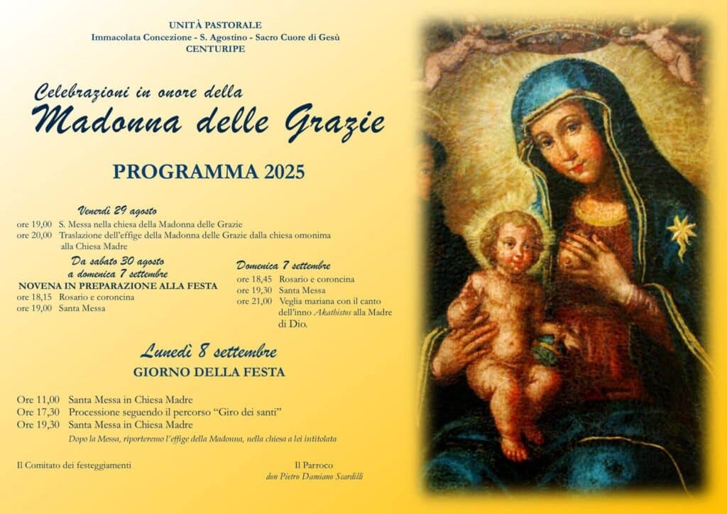 Tra folklore e tradizione ogni anno a Centuripe si celebra la festività della Madonna delle Grazie. Il culto della Madonna delle Grazie nacque a Centuripe nel XVI secolo quando il frate agostiniano Andrea Del Guasto fece costruire un Santuario dedicato alla Madonna delle Grazie in un’originaria grotta. Il Santuario ancora oggi custodisce il quadro della Vergine che allatta Gesù Bambino, con accanto Santa Monica e Sant’Agostino.