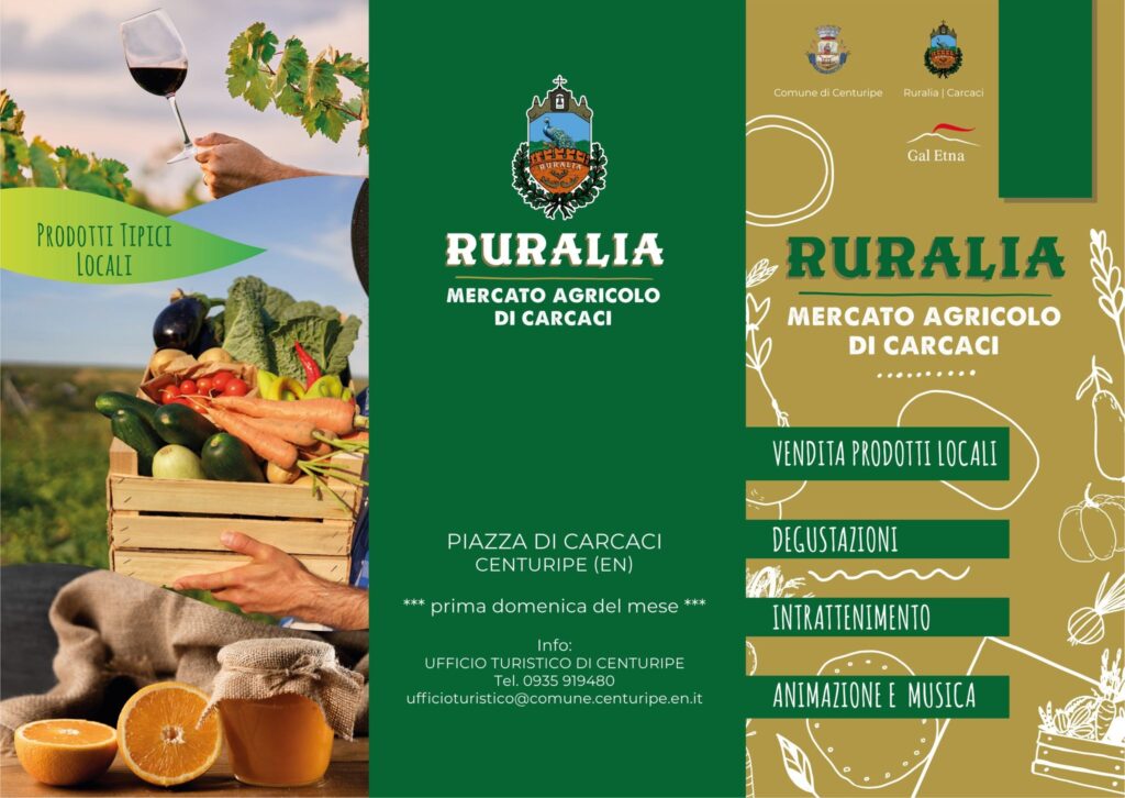 MERCATO AGRICOLO DI CARCACI Ruralia, il mercato agricolo di Carcaci, vi aspetta ogni Prima Domenica del Mese a Piazza di Carcaci – Centuripe (EN) con prodotti locali, degustazioni, intrattenimento, animazione e musica.