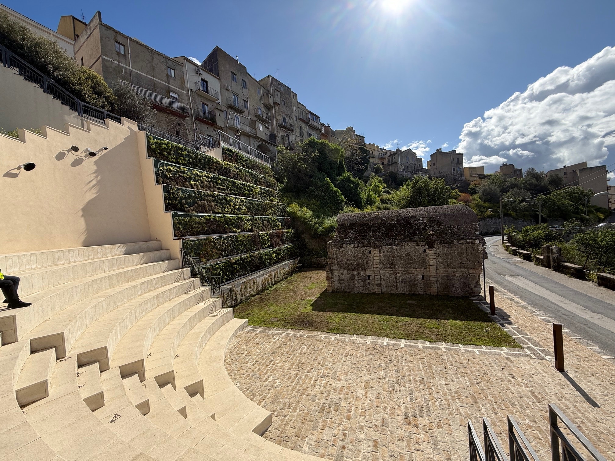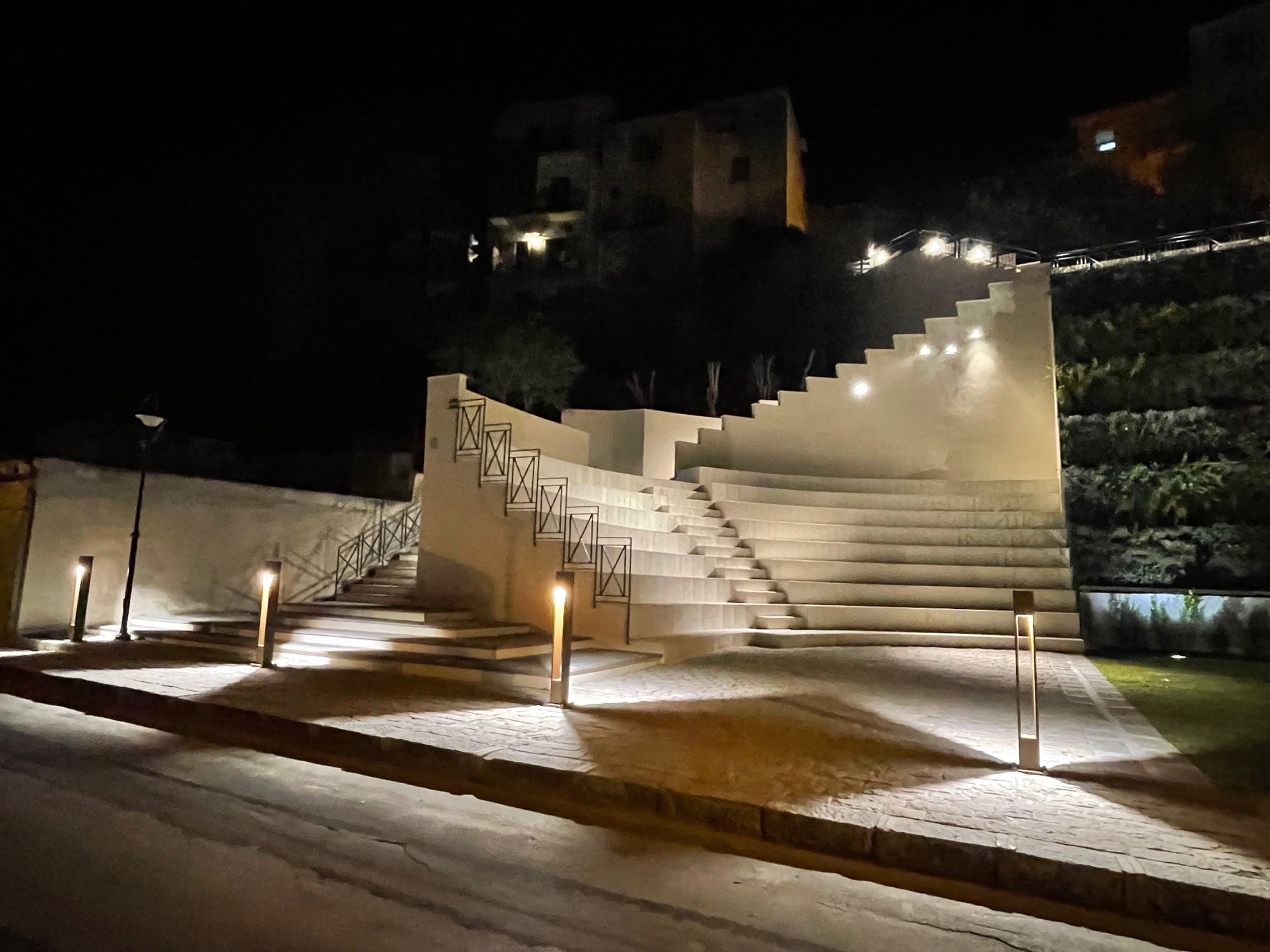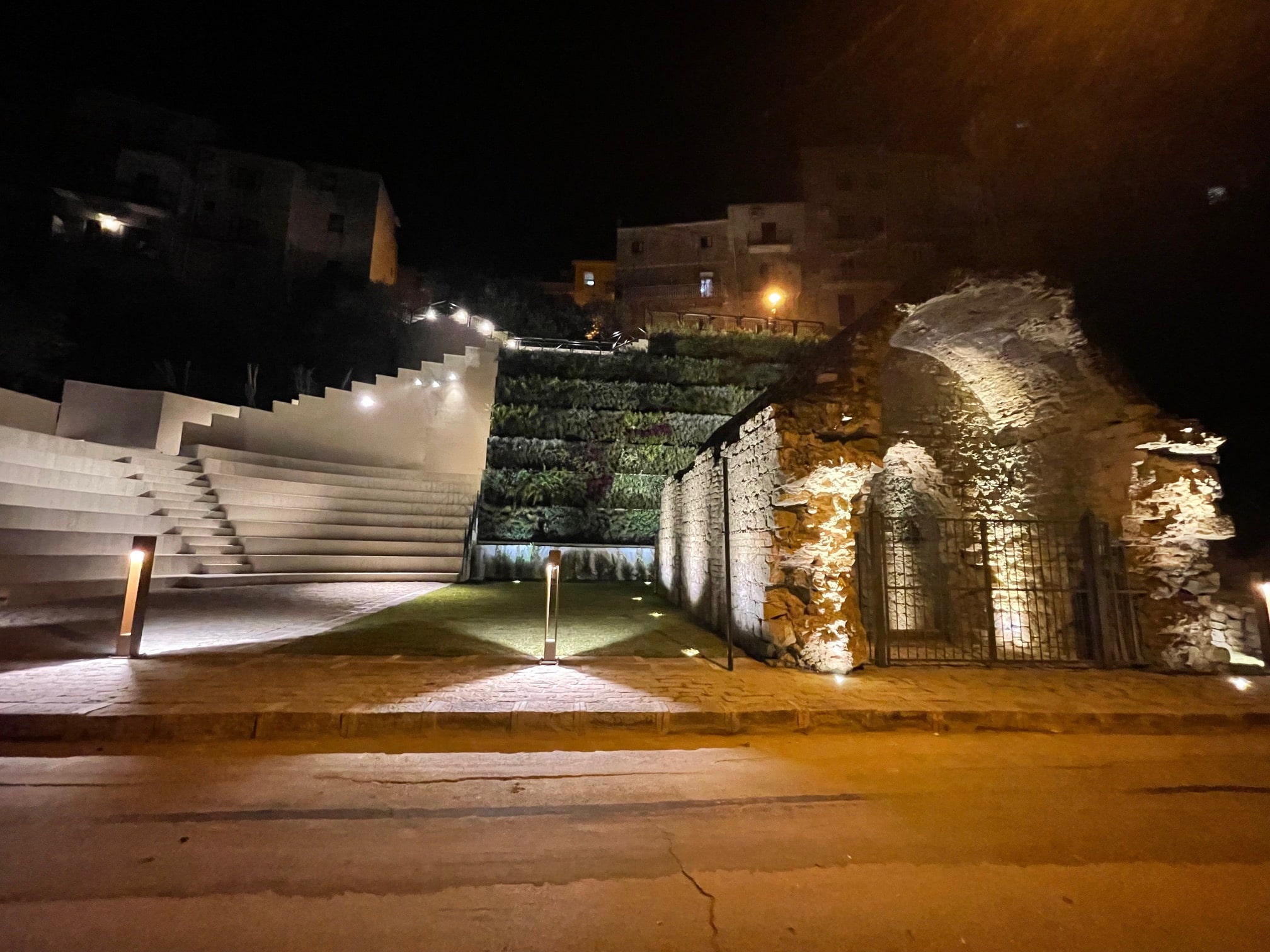 I lavori hanno interessato alcuni elementi che costituisco l’area: il recupero del teatro, una struttura degli anni Ottanta del Novecento che richiedeva oltre che una consistente manutenzione, un intervento di risanamento strutturale delle gradinate; la valorizzazione del muraglione di sostegno dove è stato realizzato il più grande giardino verticale pubblico della Sicilia; la pavimentazione adiacente il teatro, il nuovo impianto di illuminazione e la valorizzazione del Mausoleo Romano di Età Imperiale ( la Dogana) che è stato circondato da un grande prato inglese e corredato da una illuminazione artistica.